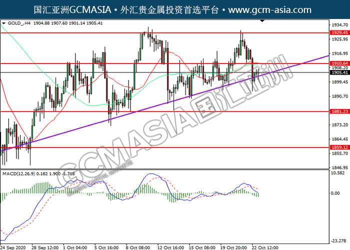 GOLD_,H4:黄金触碰上行趋线后反弹。然而,MACD空头动能略增,若下破可关注空头为主。上方关注1910.65压力和1929.45压力,下方关注1881.25支撑和1859.10支撑。