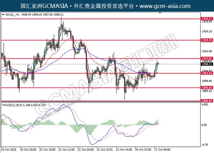 GOLD_,H1:黄金突破后持续上行。MACD显示多头信号,动能略增,短期可关注多头为主。上方关注1910.80压力和1919.80压力,下方关注1903.55支撑和1896.60支撑。