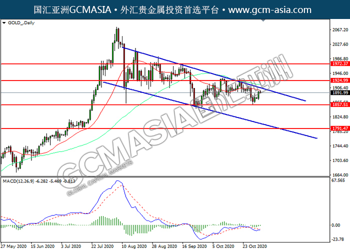 20201103 GOLD_-午间 by willy | Nov 3, 2020 | 黄金 | 0 comments GCMAsia-GOLD GOLD 2020-11-03 GOLD_,Daily:黄金震荡上行。MACD空头动能略减,短期可关注多头为主。上方关注1925.00压力和1972.35压力,下方关注1857.50支撑和1791.45支撑。