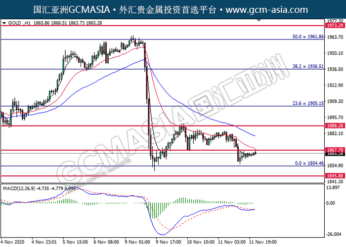 GOLD_,H1:黄金低位反弹,目前测试着压力位。MACD仍显示多头信号,动能略增,若突破可继续看多为主。上方关注1867.70压力和1888.30压力,下方关注1854.45支撑和1845.90支撑。