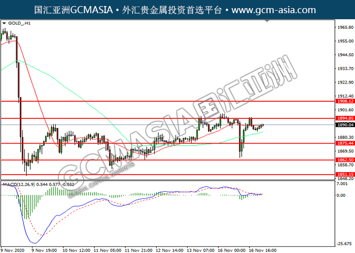 GOLD_,H1:黄金震荡上行,目前测试前期压力。MACD空头动能有所略减,若突破可关注多头为主。上方关注1894.85压力和1908.10压力,下方关注1875.45支撑和1862.50支撑。