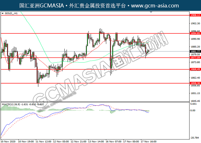 20201118 GOLD by willy | Nov 18, 2020 | 黄金 | 0 comments GCMAsia-GOLD GOLD 2020-11-18 GOLD_,H1:黄金低位反弹。MACD空头动能有所略减,短期可关注多头为主。上方关注1894.85压力和1908.10压力,下方关注1877.10支撑和1868.50支撑。