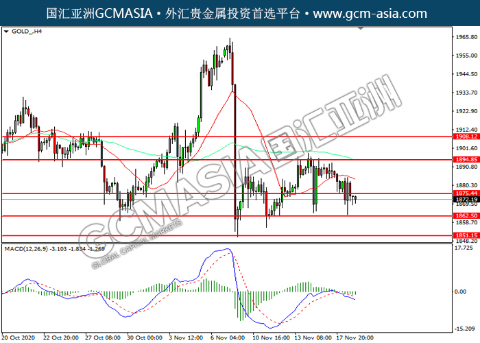 GOLD_,H4:黄金下破前期支撑,震荡下行。MACD空头动能有所略增,短期可关注空头为主。上方关注1875.45压力和1894.85压力,下方关注1862.50支撑和1851.15支撑。