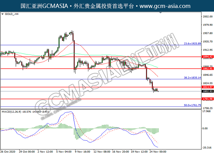 GOLD_,H4:黄金突破后持续下行。然而,MACD空头动能略减,短期可关注技术性回调为主。上方关注1813.95压力和1835.15压力,下方关注1782.00支撑和1761.80支撑。