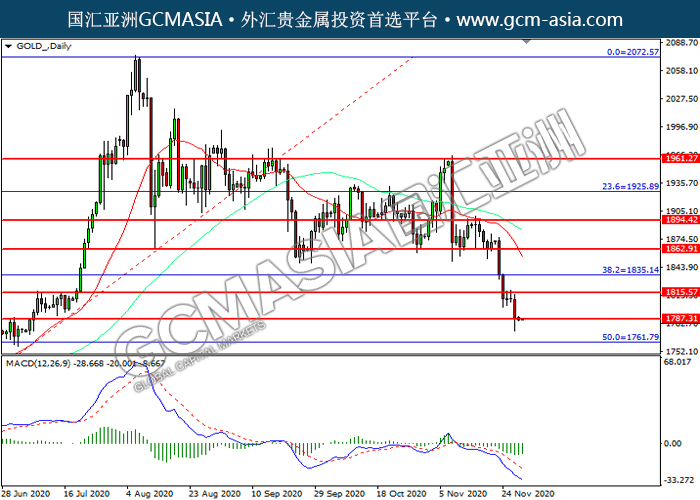 GOLD_,Daily:黄金震荡下行,目前测试前期支撑。然而,MACD空头动能略减,短期关注技术性回调为主。上方关注1815.55压力和1835.15压力,下方关注1787.30支撑和1761.80支撑。