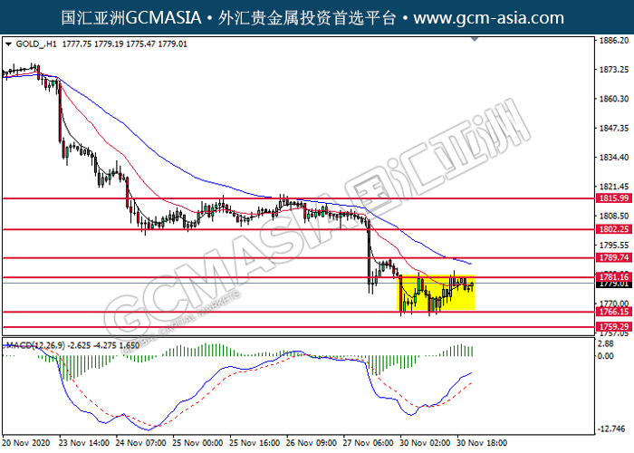 20201201 GOLD_ by willy | Dec 1, 2020 | 黄金 | 0 comments GCMAsia-GOLD_ GOLD_ 2020-12-01 GOLD_,H1:黄金高位承压后回落。MACD多头动能略减,短期可关注空头为主。上方关注1781.15压力和1789.75压力,下方关注1766.15支撑和1759.30支撑。