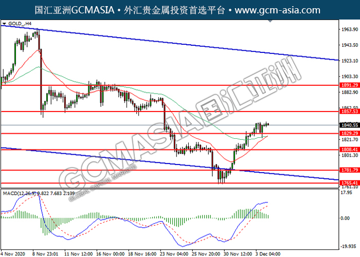 GOLD_,H4:黄金突破前期压力,震荡上行。然而,MACD多头动能有所略减,短期关注技术性回调为主。上方关注1857.55压力和1891.30压力,下方关注1829.30支撑和1808.40支撑。