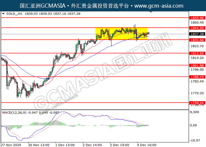 20201207 GOLD_-午间 by willy | Dec 7, 2020 | 黄金 | 0 comments GCMAsia-GOLD GOLD 2020-12-07 GOLD_,H1:黄金低位反弹。MACD仍显示多头信号,动能略增,短期可继续看多为主。上方关注1844.50压力和1855.95压力,下方关注1830.65支撑和1815.50支撑。