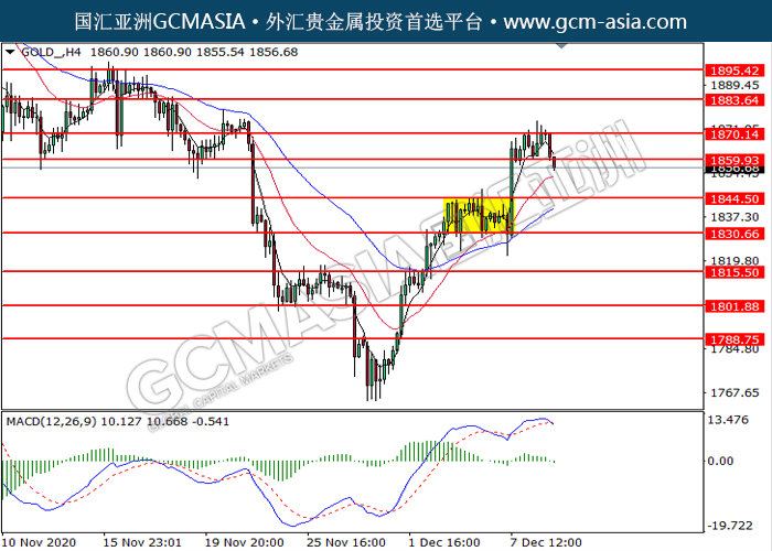GOLD_,H4:黄金高位承压后回落,目前测试着支撑位。MACD显示空头信号,动能略减,若突破可关注空头为主。上方关注1870.15压力和1883.65压力,下方关注1859.95支撑和1844.50支撑。