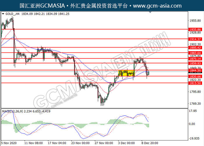 20201210 GOLD-午间 by keyk | Dec 10, 2020 | 黄金 | 0 comments GCMAsia-GOLD GOLD 2020-12-10 GOLD_,H4:黄金低位反弹。MACD显示多头信号,动能略增,短期可关注反弹为主。上方关注1844.50压力和1859.95压力,下方关注1830.65支撑和1815.50支撑。