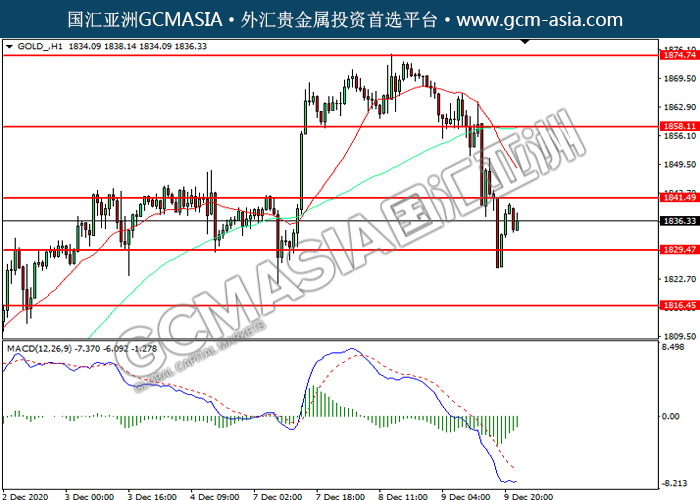 20201210 GOLD by willy | Dec 10, 2020 | 黄金 | 0 comments GCMAsia-GOLD GOLD 2020-12-10 GOLD_,H1:黄金高位回落。然而,MACD空头动能略减,短期可关注技术性回调为主。上方关注1841.50压力和1858.10压力,下方关注1829.45支撑和1816.45支撑。