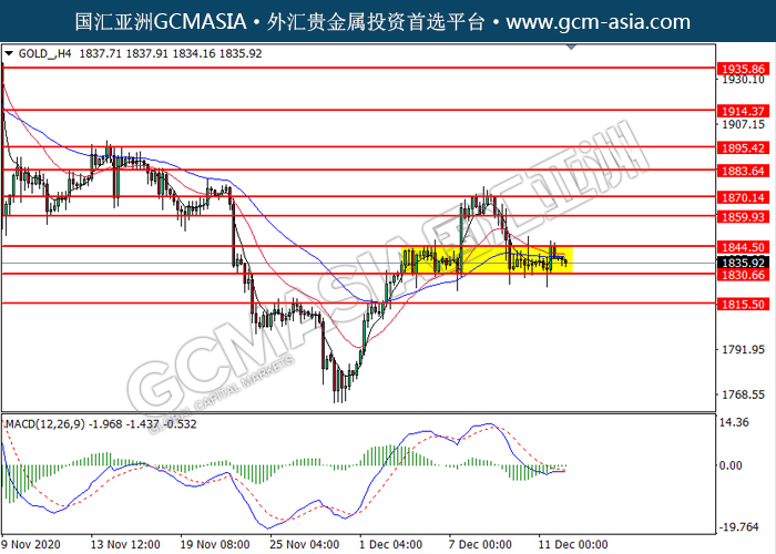 GOLD_,H4:黄金高位承压后回落。然而,MACD显示多头信号,动能略增,短期可关注技术性反弹为主。上方关注1844.50压力和1859.95压力,下方关注1830.65支撑和1815.50支撑。
