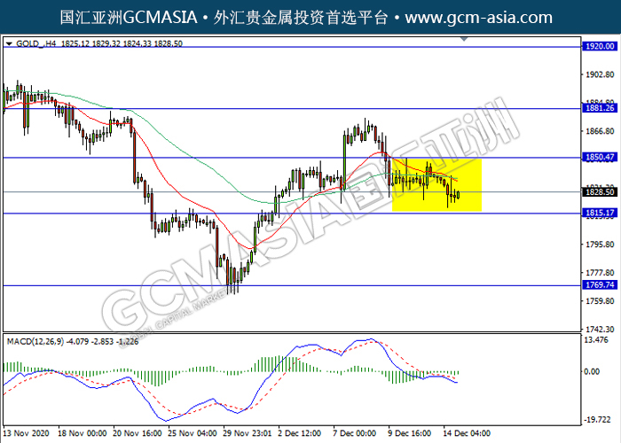GOLD_,H4:黄金仍区间交易,目前测试靠近前期支撑。然而,MACD空头动能略减,短期关注多头趋势为主。上方关注1850.45压力和1881.25压力,下方关注1815.15支撑和1769.75支撑。
