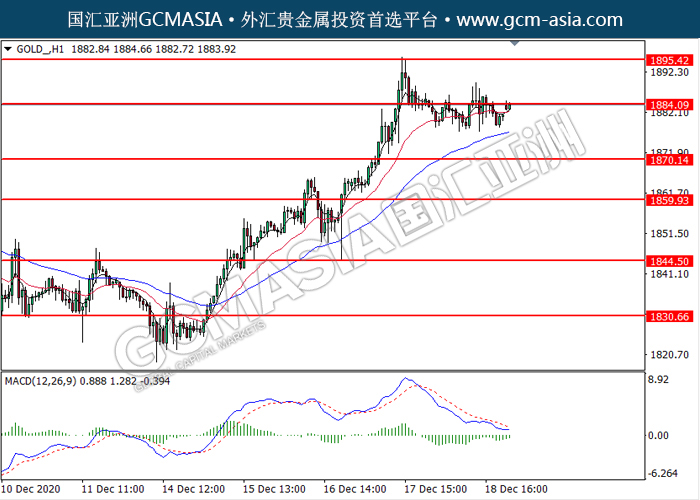 GOLD_,H1:黄金低位反弹,目前测试着压力位。MACD显示多头信号,动能略增,短期可关注多头走势为主。上方关注1884.10压力和1895.40压力,下方关注1870.15支撑和1859.95支撑。
