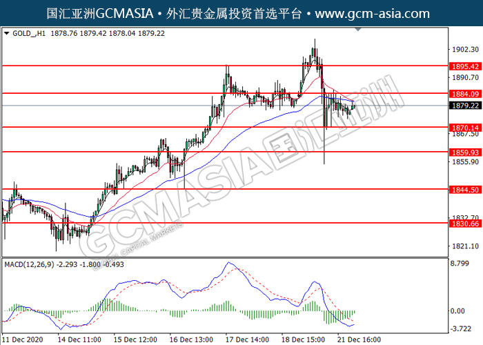 GOLD_,H1:黄金低位反弹。MACD显示多头信号,动能略增,短期可关注多头走势为主。上方关注1884.10压力和1895.40压力,下方关注1870.15支撑和1859.95支撑。