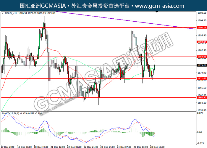 20201229 GOLD by willy | Dec 29, 2020 | 黄金 | 0 comments GCMAsia-GOLD GOLD 2020-12-29 GOLD_,H1:黄金低位反弹。MACD空头动能略减,短期可关注多头走势为主。上方关注1883.80压力和1892.05压力,下方关注1871.65支撑和1860.90支撑。
