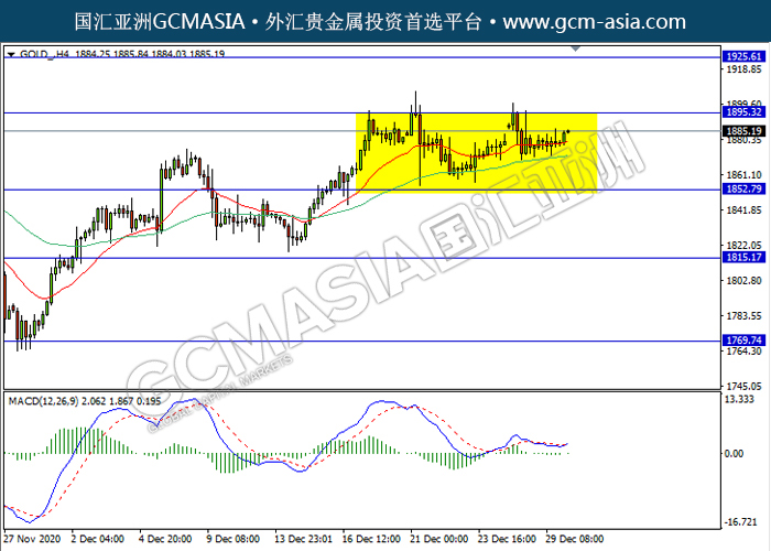 GOLD_,H4:黄金仍区间震荡盘整。由于MACD缺乏动能和清晰方向,建议等更明确的信号出现才进入市场。上方关注1895.30压力和1925.60压力,下方关注1852.80支撑和1815.15支撑。