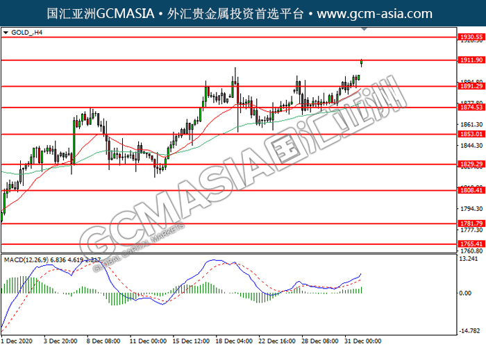 GOLD_,H4:黄金震荡上行,目前测试前期压力。MACD多头动能略增,若突破可关注多头走势为主。上方关注1911.90压力和1930.55压力,下方关注1891.30支撑和1874.55支撑。
