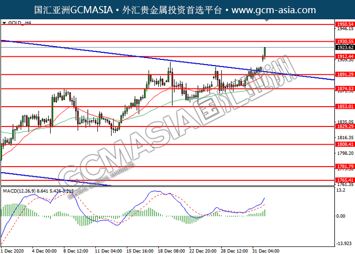 GOLD_,H4:黄金震荡上行,目前测试前期压力。MACD多头动能略增,若突破可关注多头走势为主。上方关注1911.90压力和1930.55压力,下方关注1891.30支撑和1874.55支撑。