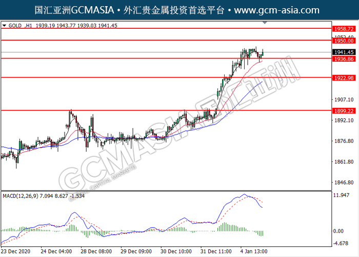 20210105 GOLD_-午间 by willy | Jan 5, 2021 | 黄金 | 0 comments GCMAsia-GOLD GOLD 2021-01-05 GOLD_,H1:黄金低位反弹。MACD空头动能略减,短期可关注反弹为主。上方关注1950.00压力和1958.70压力,下方关注1936.85支撑和1923.00支撑。