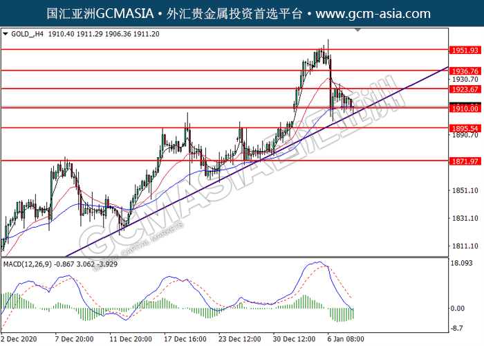 GOLD_,H4:黄金高位承压后回落,目前测试着支撑位。然而,MACD空头动能略减,短期可关注技术性上调为主。上方关注1923.65压力和1936.75压力,下方关注1910.00支撑和1895.55支撑。