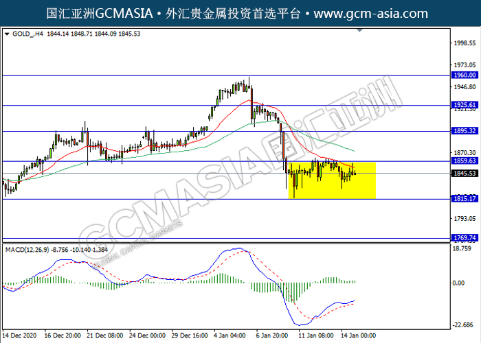 GOLD_,H4:黄金仍区间震荡盘整。然而,MACD显示空头信号,多头动能略减,短期关注空头方向为主。上方关注1859.65压力和1895.30压力,下方关注1815.15支撑和1769.75支撑。