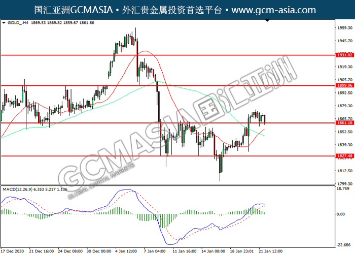 GOLD_,H4:黄金仍区间震荡盘整,目前测试前期支撑。然而,MACD显示空头信号,多头动能略减,若下破可关注空头方向为主。上方关注1899.95压力和1931.00压力,下方关注1861.20支撑和1827.50支撑。