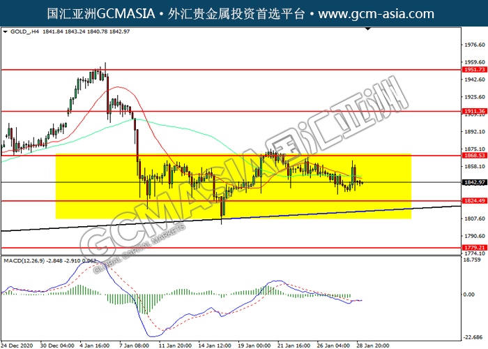 20210129 GOLD-午间 by keyk | Jan 29, 2021 | 黄金 | 0 comments GCMAsia-GOLD GOLD 2021-01-29 GOLD_,H4:黄金价格高位回落。MACD空头动能略增,短期关注空头方向为主。上方关注1868.55压力和1911.35压力,下方关注1824.50支撑和1779.20支撑。