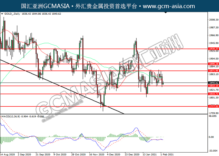 GOLD_,Daily:黄金震荡下行,目前测试前期支撑。然而,MACD未显示太多信号,建议投资者等待更多信号后在进入市场。上方关注1871.95压力和1890.30压力,下方关注1832.15支撑和1810.70支撑。