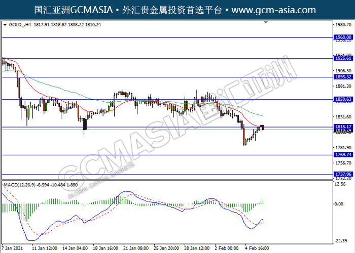 GOLD_,H4:黄金近期低位反弹上行,目前测试前期压力。MACD形成金叉,动能略知,若突破继续看多为主。上方关注1815.15压力和1895.30压力,下方关注1769.75支撑和1737.95支撑。