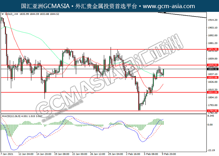 GOLD_,H4:黄金近期低位反弹上行。然而,MACD多头动能开始略减,短期关注技术性回调为主。上方关注1849.95压力和1871.95压力,下方关注1832.05支撑和1811.05支撑。