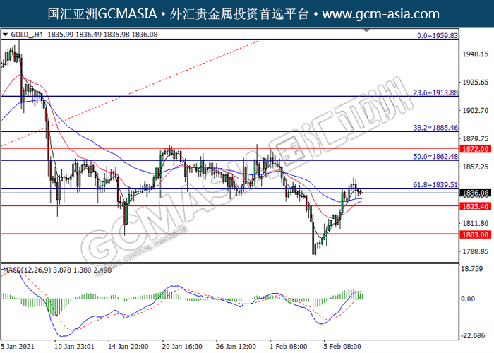 GOLD_,H4:黄金高位承压后回落。MACD转向空头,动能略减,短期可关注空头趋势为主。上方关注1839.50压力和1862.50压力,下方关注1825.40支撑和1803.00支撑。