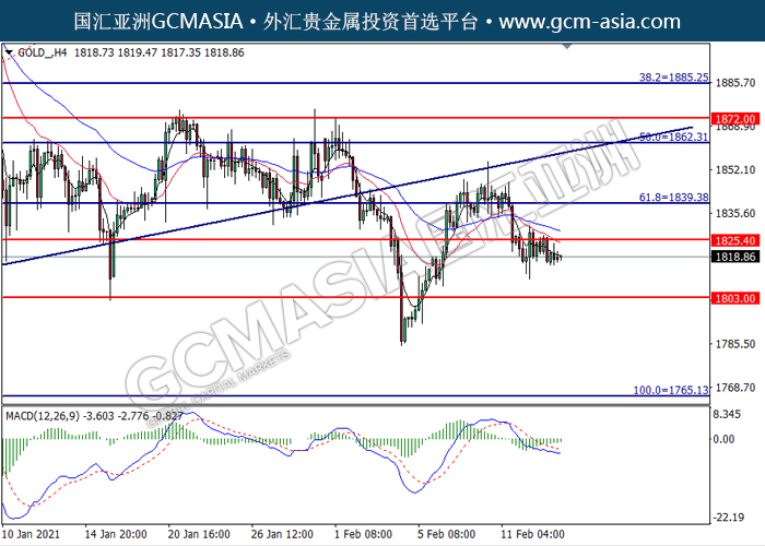 GOLD_,H4:黄金高位承压后回落。然而,MACD转向多头,动能略增,短期可关注多头趋势为主。上方关注1825.40压力和1839.40压力,下方关注1803.00支撑和1765.15支撑。