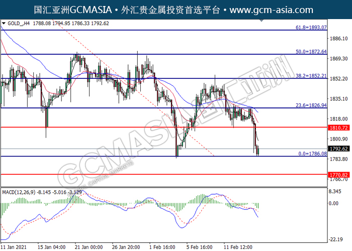 GOLD_,H4:黄金高位承压后回落,目前测试着支撑位。MACD转向空头,动能略减,若突破可关注空头趋势为主。上方关注1810.70压力和1826.95压力,下方关注1786.10支撑和1770.80支撑。