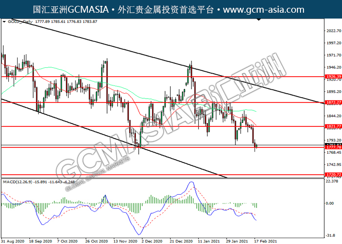 GOLD_,Daily:黄金高位承压回落,目前测试前期支撑。MACD空头动能略增,若突破可关注空头为主。上方关注1821.75压力和1872.75压力,下方关注1777.80支撑和1720.70支撑。