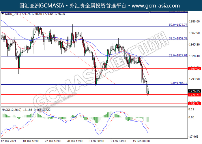 20210218 GOLD_ by willy | Feb 18, 2021 | 黄金 | 0 comments GCMAsia - GOLD GOLD 2021-02-18 GOLD_,H4:黄金低位反弹。MACD转向多头,动能略增,短期可关注多头趋势为主。上方关注1786.10压力和1809.90压力,下方关注1770.70支撑和1757.70支撑。