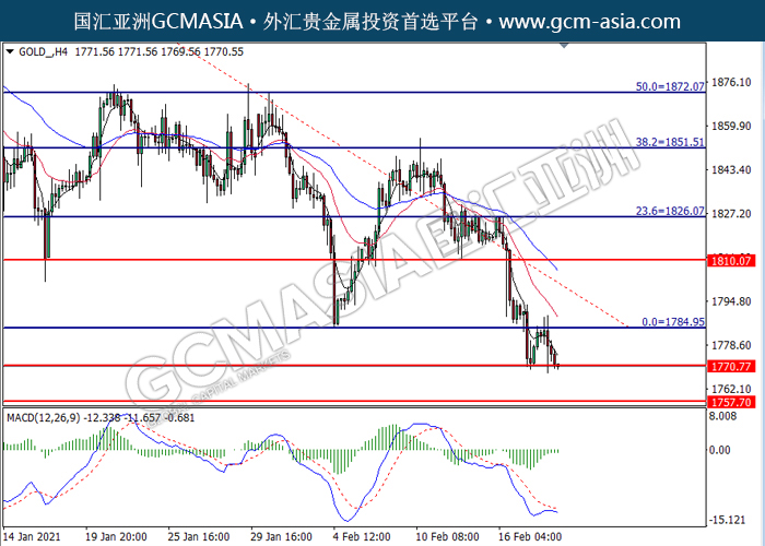 GOLD_,H4:黄金高位承压后回落,目前测试着支撑位。MACD转向多头,动能略增,短期可关注技术性上调为主。上方关注1784.95压力和1810.10压力,下方关注1770.70支撑和1757.70支撑。