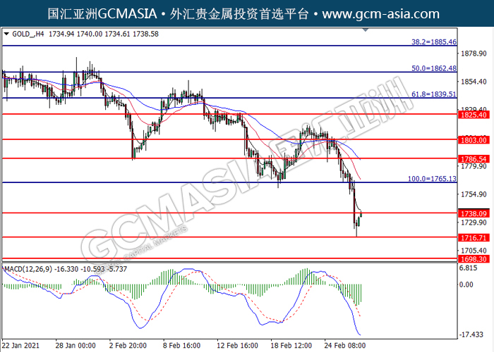 GOLD_,H4:黄金低位反弹,目前测试着压力位。MACD显示多头信号,动能略增,若突破可关注多头趋势为主。上方关注1738.10压力和1765.15压力,下方关注1716.70支撑和1698.30支撑。