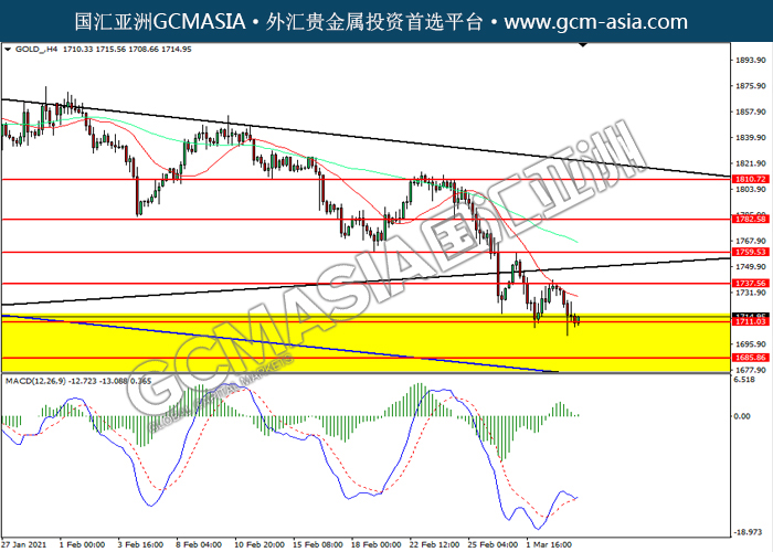 GOLD_,H4:黄金价格震荡下行,目前测试前期支撑。MACD多头动能略减,若下破可关注空头为主。上方关注1737.55压力和1759.55压力,下方关注1711.05支撑和1685.85支撑。