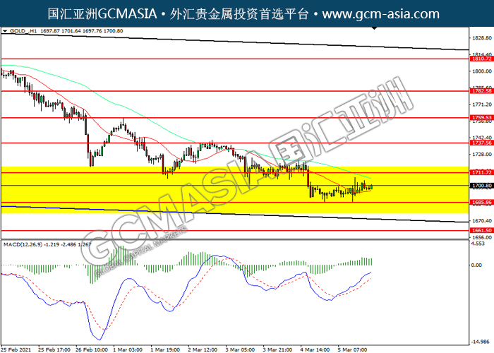 20210308 GOLD by willy | Mar 8, 2021 | 黄金 | 0 comments GCMAsia-GOLD GOLD 2021-03-08 GOLD_,H1:黄金震荡上行。MACD多头动能略增,短期可关注多头为主。上方关注1711.70压力和1737.55压力,下方关注1685.85支撑和1661.50支撑。