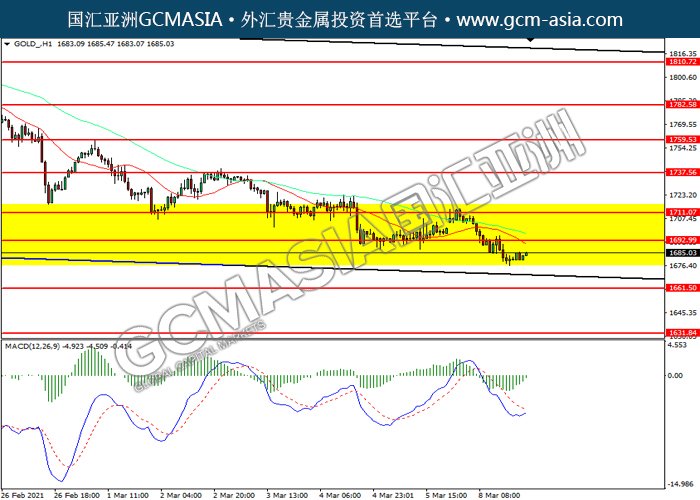 GOLD_,H1:黄金下破前期支撑,震荡下行。然而,MACD空头动能略减,短期可关注技术性回调为主。上方关注1693.00压力和1711.05压力,下方关注1661.50支撑和1631.85支撑。