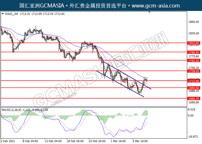 GOLD_,H4:黄金高位承压后回落,目前测试着支撑位。MACD显示空头信号,动能略减,若突破可持续关注空头趋势为主。上方关注1738.10压力和1765.20压力,下方关注1712.45支撑和1694.05支撑。