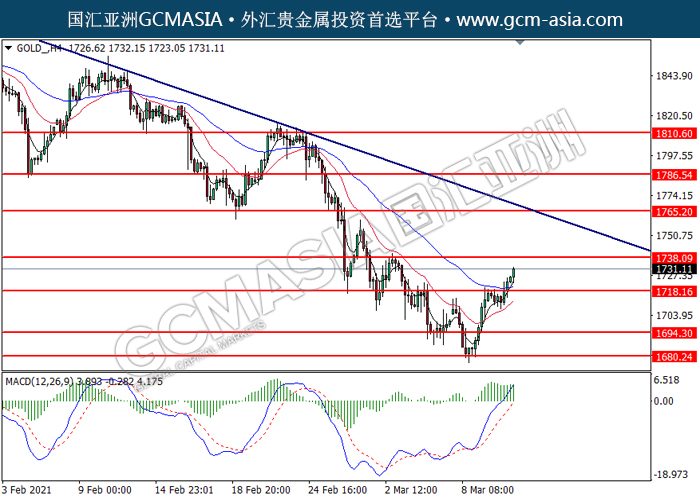 GOLD_,H4:黄金突破后持续上行。MACD显示多头信号,动能略增,短期可持续关注多头趋势为主。上方关注1738.10压力和1765.20压力,下方关注1718.15支撑和1694.30支撑。