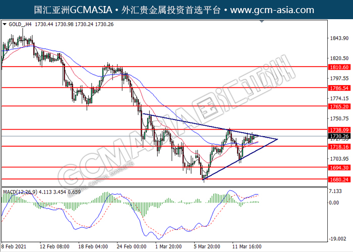 GOLD_,H4:黄金低位反,目前测试着三角趋势的顶部。然而,MACD显示空头信号,动能略减,短期可关注技术性回调为主。上方关注1738.10压力和1765.20压力,下方关注1718.15支撑和1694.30支撑。