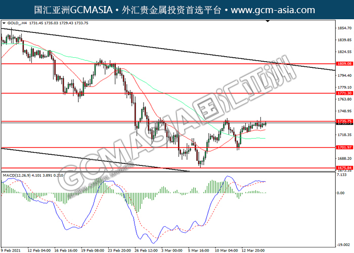 GOLD_,H4:黄金震荡上行,目前测试前期压力。MACD多头动能略增,短期可关注多头为主。上方关注1735.75压力和1771.30压力,下方关注17091.95支撑和1685.95支撑。