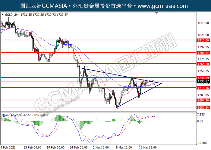 GOLD_,H4:黄金突破后持续上行,目前测试着压力位。然而,MACD显示空头信号,动能略减,短期可关注技术性回调为主。上方关注1738.10压力和1765.20压力,下方关注1718.15支撑和1694.30支撑。