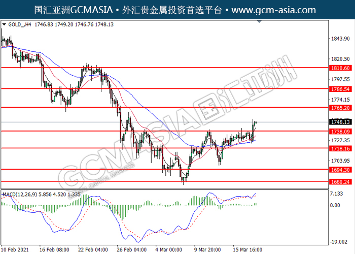 GOLD_,H4:黄金突破后持续上行。MACD显示多头信号,动能略增,短期可关注多头为主。上方关注1765.20压力和1786.55压力,下方关注1738.10支撑和1718.15支撑。