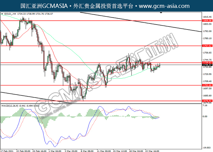 GOLD_,H4:黄金震荡盘整,目前测试前期压力。MACD空头动能略减,若突破可关注多头为主。上方关注1739.85压力和1767.60压力,下方关注1702.60支撑和1676.90支撑。