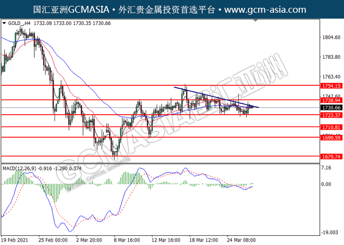 GOLD_,H4:黄金低位反弹,目前测试着下跌趋势线。MACD显示多头信号,动能略增,若突破可关注多头为主。上方关注1738.95压力和1754.15压力,下方关注1723.35支撑和1710.80支撑。