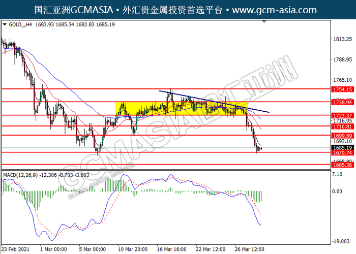 GOLD_,H4:黄金突破后持续下行,目前测试着支撑位。MACD显示空头信号,动能略减,若突破可关注空头为主。上方关注1699.60压力和1710.80压力,下方关注1679.75支撑和1665.35支撑。
